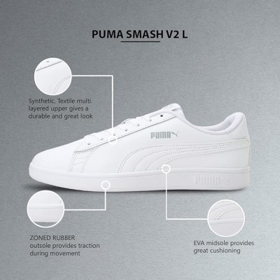 • Giày sneaker Puma Smash V2 L Unisex là sự thể hiện của Puma Smash huyền thoại; Lấy cảm hứng từ quần vợt, đôi giày thể thao này gây ấn tượng với độ vừa vặn tốt hơn và phần thân trên bằng da mềm mại.