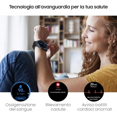 • Galaxy Watch3 misura la frequenza cardiaca, rileva i battiti irregolari, monitora l'ossigenazione del sangue. Riconosce automaticamente la caduta e invia SOS con la posizione ai contatti di emergenza