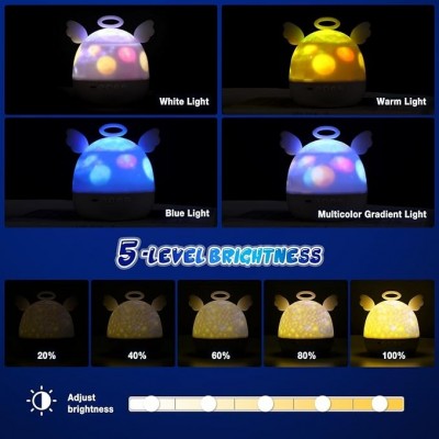 Nghi thức ban đêm được cá nhân hóa: Bốn màu ánh sáng dịu và năm mức độ sáng có thể điều chỉnh tạo ra một môi trường ấm cúng trước khi ngủ. Được trang bị 20 bài hát ru êm dịu, đèn ngủ cho trẻ em của chúng tôi mang đến bầu không khí thoải mái và ấm áp, thích hợp làm ánh sáng và nhạc nền cho những câu chuyện trước khi đi ngủ.